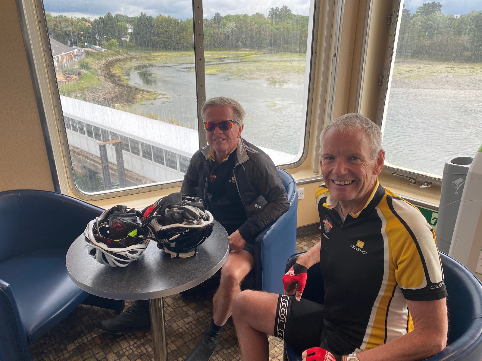 And now the riding really improved. Long stretches of quiet, well-surfaced roads took us swiftly westwards, parallel to a fine clifftop coastal path, and we were able to form a proper peloton with nice views to the sea in brightening weather. A final climb up from Freshwater Bay led us northwards again, and suddenly we were back at the port. 95km in all, ride time 4h 17m, with 1385m of ascent.